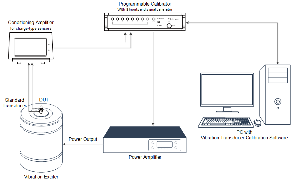 The ECON Vibration Transducer Calibration System consists of a programmable calibrator, a standard exciter, a reference sensor, and a conditioning amplifier. The programmable calibrator provides the system's input signal and signal generator output. IEPE sensors or voltage-output transducers can be directly connected to the programmable calibrator. The conditioning amplifier provides signal conditioning and pre-amplification for charge-type sensors. For piezoresistive and other bridge type transducers, MI-1501 Bridge Amplifier is used for powering and conditioning. MI-2104 Sensor Adapter can also be used for powering variable capacitance and other transducers and can be configured with different excitation voltages.